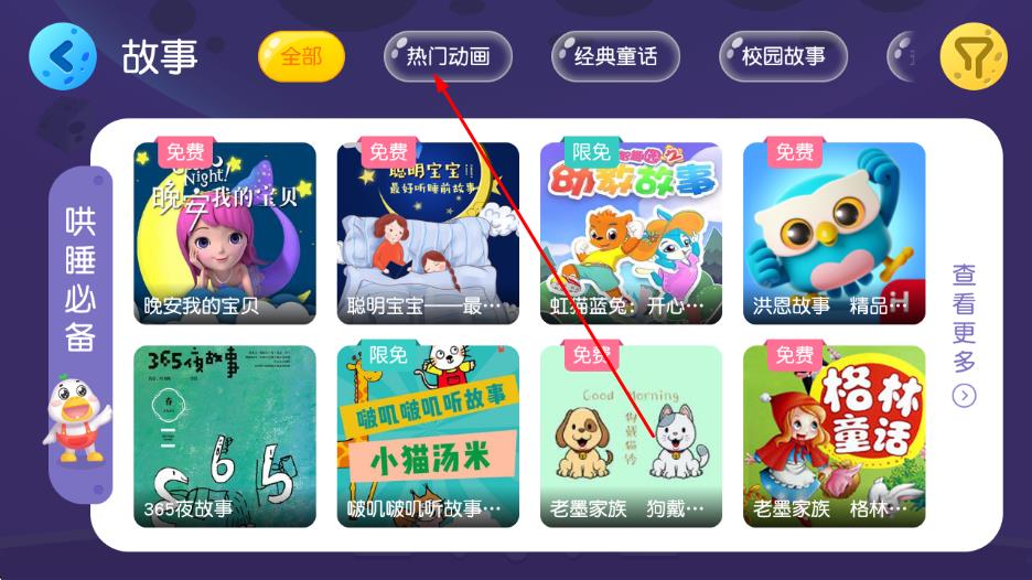 2、進(jìn)入“故事”頁(yè)面后,點(diǎn)擊上方分類標(biāo)簽中的熱門動(dòng)畫。