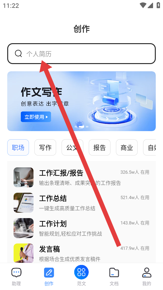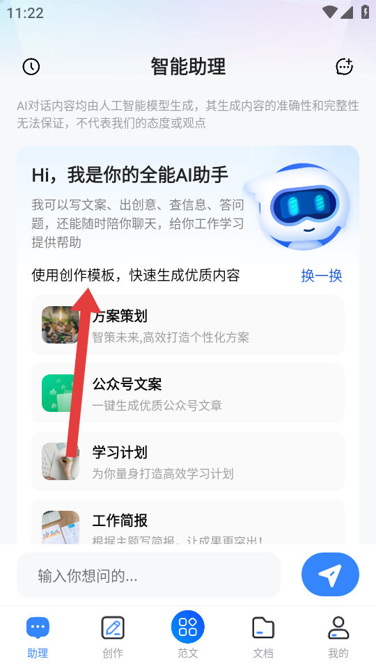 1、在智能助理的界面,可以選擇點擊使用創(chuàng)作模板的區(qū)域,進入模板選擇頁,快速生成方案、文案等內(nèi)容。