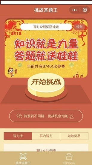 當(dāng)天邀請(qǐng)獲得的挑戰(zhàn)機(jī)會(huì),當(dāng)天可以使用一次。其余僅第2天可以使用,請(qǐng)及時(shí)參賽。當(dāng)你有挑戰(zhàn)資格時(shí),首頁“支付按鈕”會(huì)變成“開始挑戰(zhàn)”按鈕,點(diǎn)擊即可開始挑戰(zhàn)。每次挑戰(zhàn)包含12道題目,全部答對(duì)即可獲得娃娃。