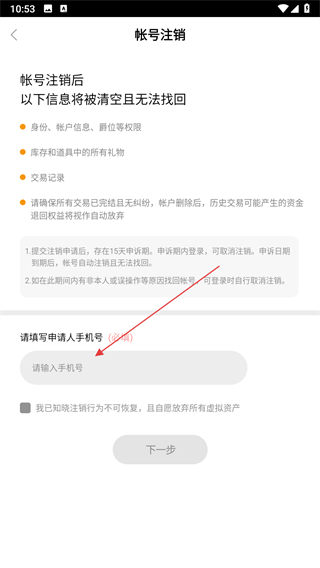 3、在帳號(hào)注銷頁面,填寫申請(qǐng)人手機(jī)號(hào),然后點(diǎn)擊下一步。