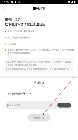 4、輸入密保手機(jī)收到的驗(yàn)證碼,點(diǎn)擊申請(qǐng)注銷,等待平臺(tái)審核處理,完成小熊直播賬號(hào)的注銷。