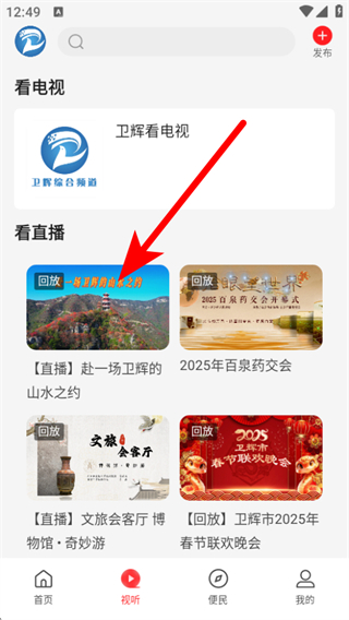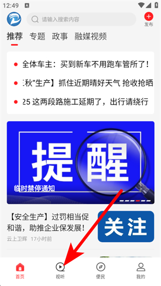 1、在云上衛(wèi)輝首頁,點(diǎn)擊底部視聽按鈕,進(jìn)入視聽的頁面。