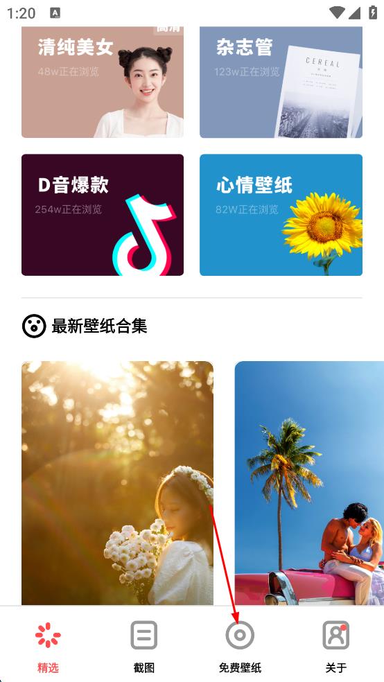 1、打開(kāi)壁紙軟件,點(diǎn)擊底部“免費(fèi)壁紙”選項(xiàng),進(jìn)入免費(fèi)壁紙頁(yè)面。
