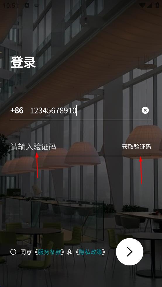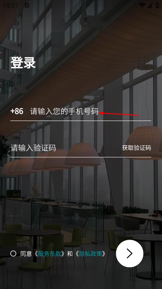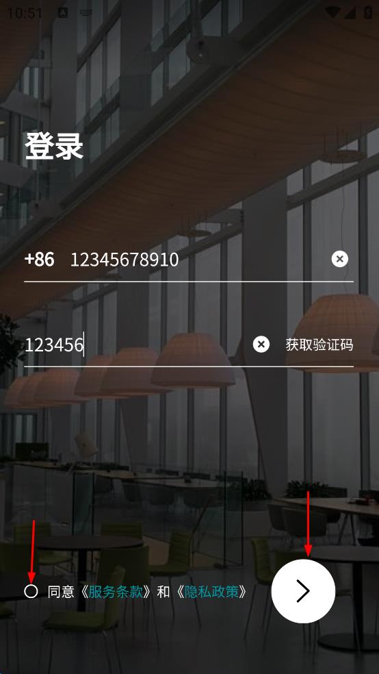 4、同意服務條款和隱私政策選項,最后點擊頁面下方的箭頭按鈕,完成登錄。