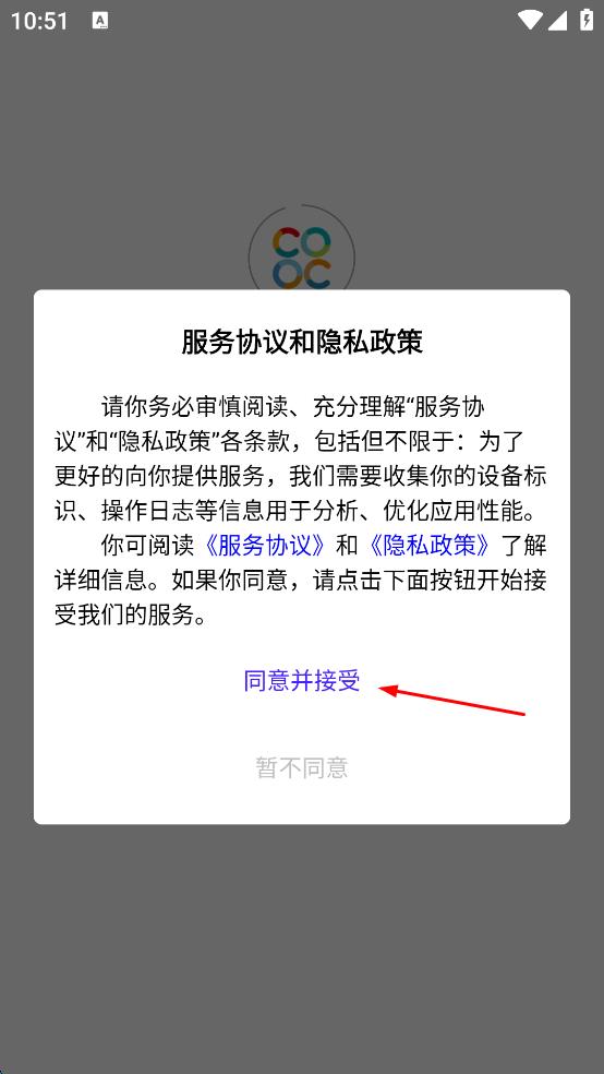 1、打開社交類軟件,會彈出“服務協(xié)議和隱私政策”提示框,仔細閱讀后,點擊“同意并接受”按鈕。