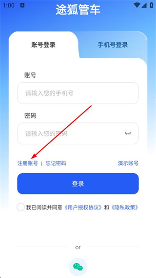 1、打開(kāi)途狐管車APP,在登錄頁(yè)面點(diǎn)擊下方的注冊(cè)賬號(hào)選項(xiàng)。