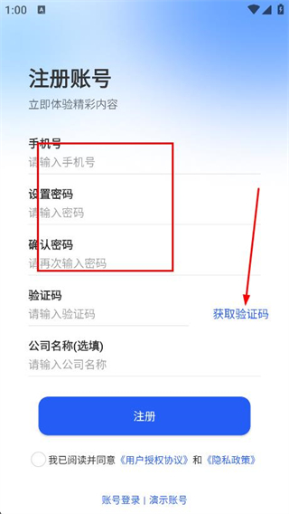 2、進(jìn)入注冊(cè)賬號(hào)頁(yè)面后,輸入手機(jī)號(hào)和密碼,并獲取驗(yàn)證碼。