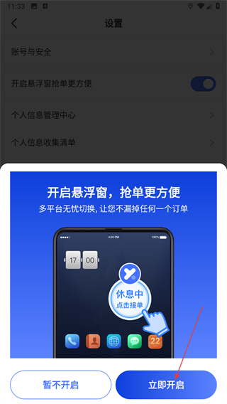 4、在彈出的開啟懸浮窗提示框中點(diǎn)擊立即開啟按鈕。