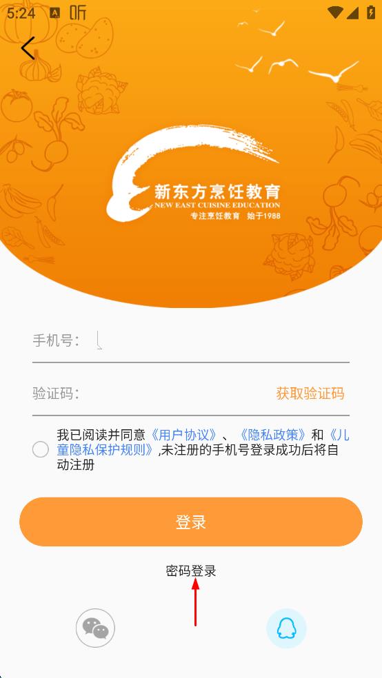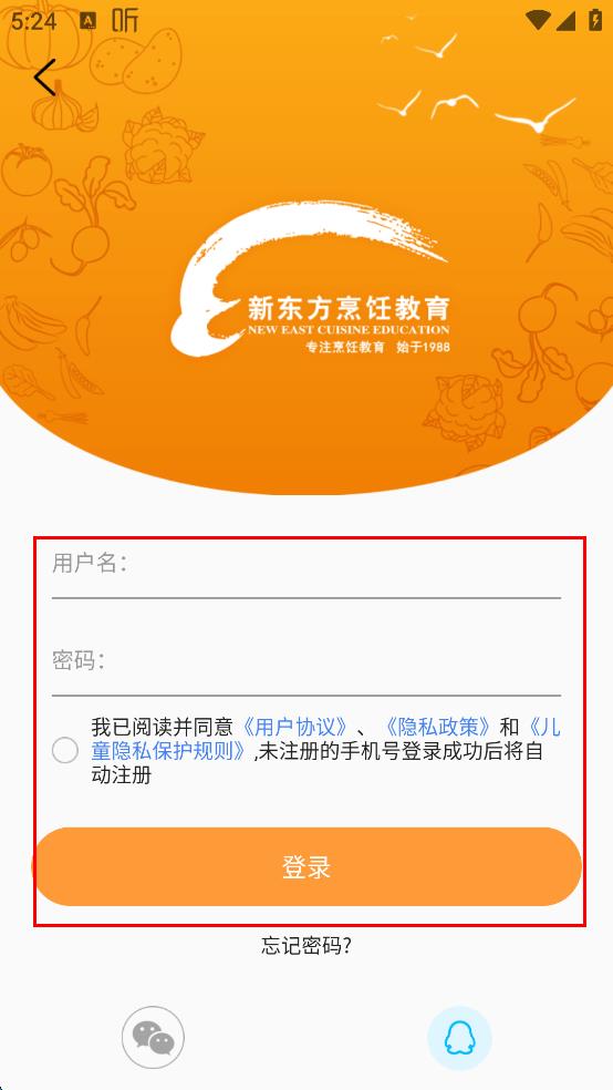 4、在密碼登錄界面,輸入框中輸入自己的用戶名,再輸入密碼,勾選同意協(xié)議,最后點(diǎn)擊“登錄”按鈕,即可嘗試登錄新東方烹飪教育APP。