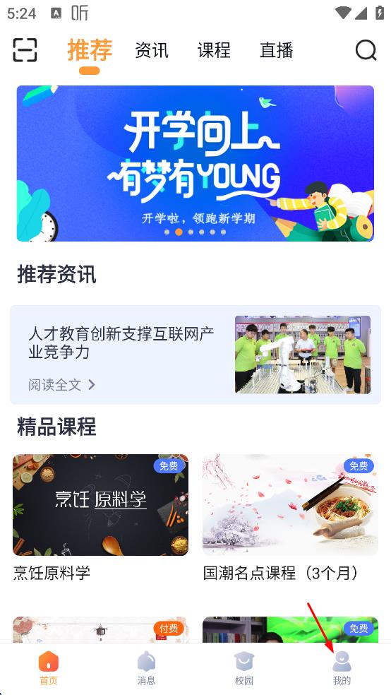 1、打開新東方烹飪教育APP,進(jìn)入首頁后,點(diǎn)擊頁面右下角“我的”選項(xiàng),進(jìn)入個(gè)人頁面。