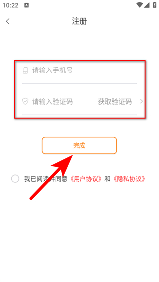 4、在注冊頁面,輸入手機(jī)號、驗(yàn)證碼后,點(diǎn)擊完成,完成注冊操作。