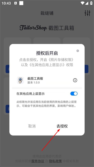 1、首頁(yè)點(diǎn)擊懸浮窗截圖,在彈出的授權(quán)窗口中點(diǎn)擊去授權(quán)。