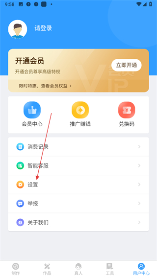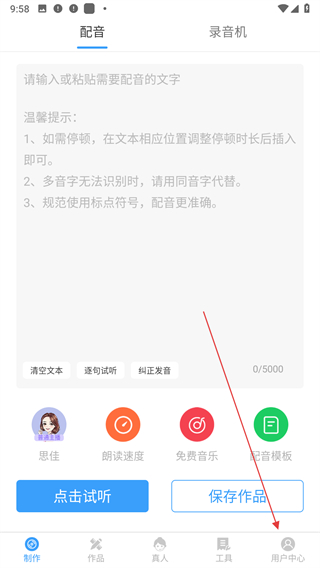 1、打開AI配音神器,點擊界面右下角的用戶中心選項,進入用戶中心頁面。