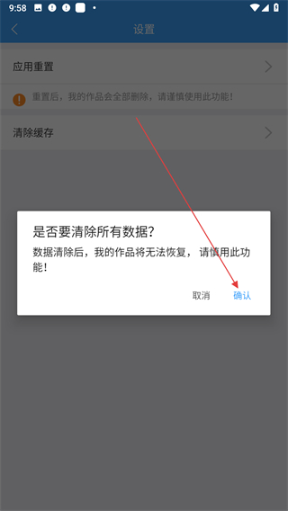 4、在提示框中,仔細閱讀提醒,點擊確認按鈕,即可完成應用的重置操作。
