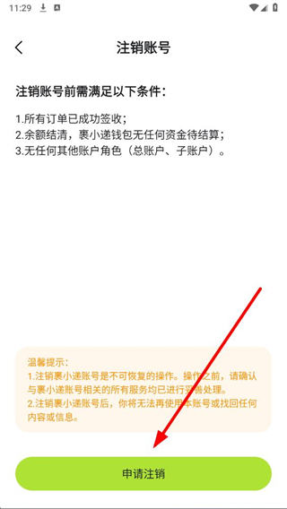 4、確認(rèn)滿(mǎn)足注銷(xiāo)賬號(hào)的所有條件后,點(diǎn)擊申請(qǐng)注銷(xiāo)按鈕,完成裹小遞賬號(hào)注銷(xiāo)操作。