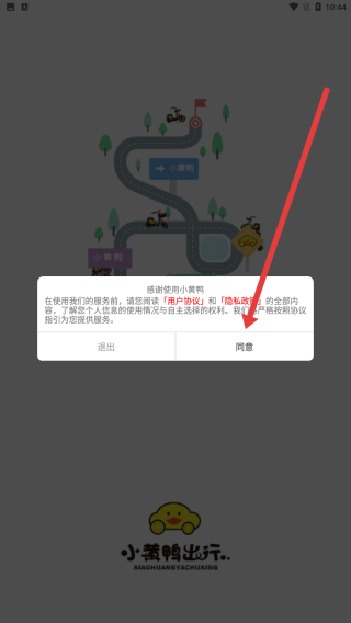 1、打開小黃鴨出行APP,彈出隱私政策提示時(shí)點(diǎn)擊同意,接受《用戶協(xié)議》與《隱私政策》,進(jìn)入應(yīng)用主界面。