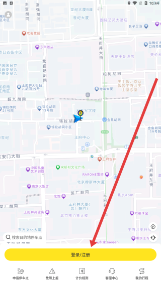 2、在小黃鴨出行地圖界面,點(diǎn)擊底部黃色登錄/注冊(cè)按鈕,進(jìn)入賬號(hào)登錄注冊(cè)賬號(hào)的操作頁面。