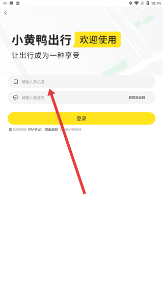 3、進(jìn)入小黃鴨出行登錄頁面,在請(qǐng)輸入手機(jī)號(hào)碼框填寫號(hào)碼,獲取驗(yàn)證碼、完成登錄賬號(hào)。