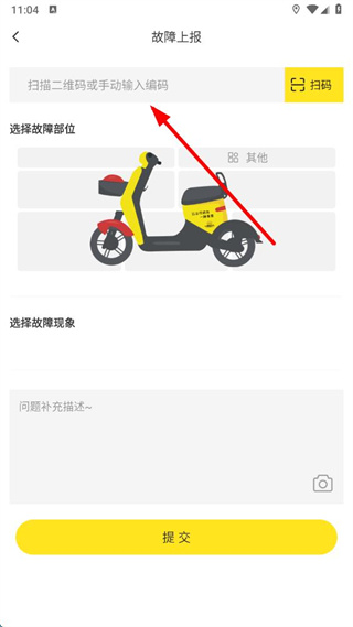 2、在故障上報(bào)頁面掃描二維碼或手動(dòng)輸入編碼,選擇故障部位和故障現(xiàn)象,可補(bǔ)充描述問題并添加圖片。