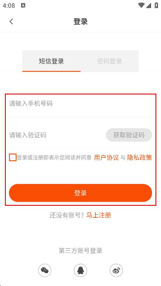 3、在驗(yàn)證碼登錄界面,輸入手機(jī)號(hào),勾選“隱私權(quán)限”,點(diǎn)擊“獲取驗(yàn)證碼”。