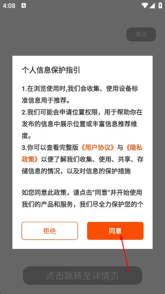 1、打開政協(xié)云App,在隱私保護(hù)提示頁面,點(diǎn)擊“同意”按鈕。