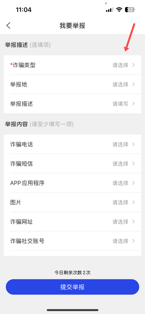 2、進(jìn)入舉報(bào)頁面后,可選擇詐騙類型,填寫舉報(bào)地、詳細(xì)的舉報(bào)描述、詐騙電話、短信、APP應(yīng)用程序、圖片、網(wǎng)址、社交賬號等信息,提交舉報(bào)。