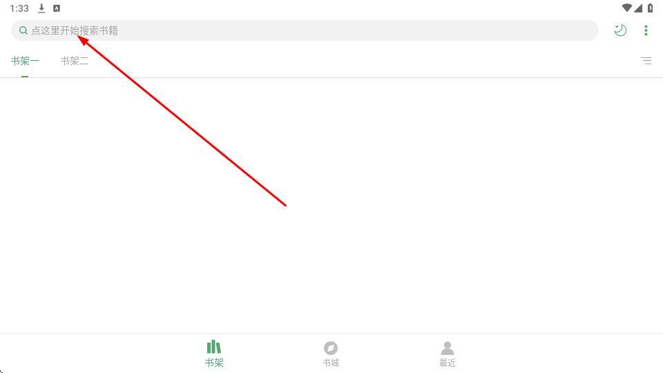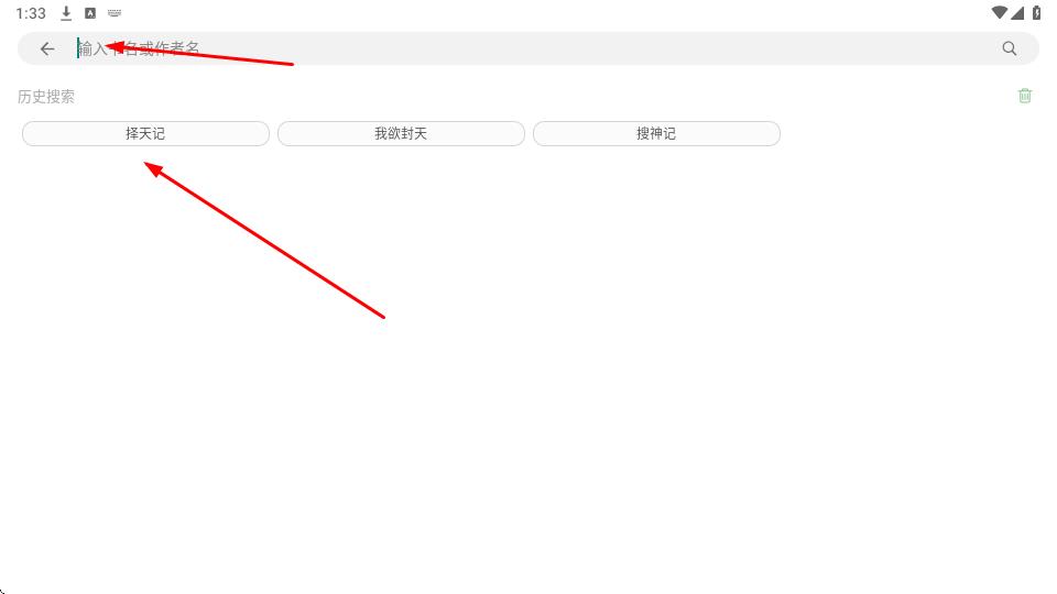 1、進(jìn)入閱讀APP的書架頁面界面頂部設(shè)有搜索欄,內(nèi)顯提示文字點(diǎn)這里開始搜索書籍,跳轉(zhuǎn)至搜索界面,頁面下方展示歷史搜索標(biāo)簽,包含擇天記,我欲封天,搜神記。