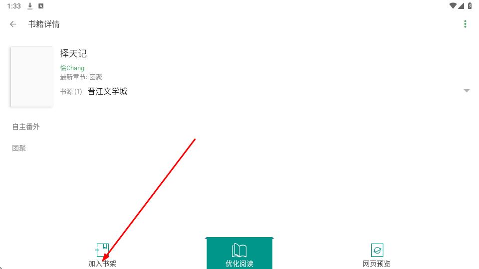 2、點(diǎn)擊擇天記標(biāo)簽,自動跳轉(zhuǎn)至《擇天記》的書籍詳情頁面,詳情頁頂部顯示書名,下方羅列作者徐Chang、最新章節(jié)團(tuán)聚、書源晉江文學(xué)城等信息。
