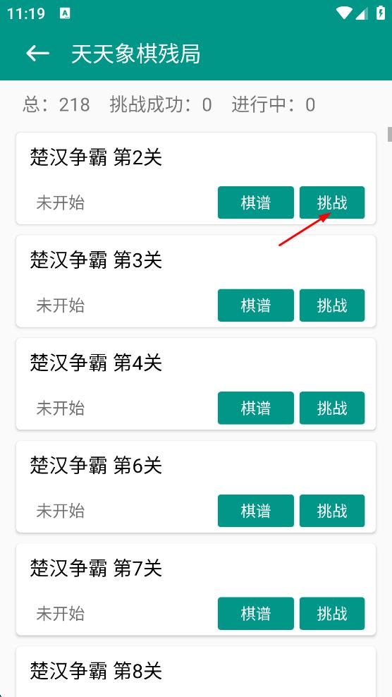 3、在天天象棋殘局關(guān)卡列表中,選擇想要挑戰(zhàn)的關(guān)卡,比如“楚漢爭(zhēng)霸 第2關(guān)”,點(diǎn)擊該關(guān)卡右側(cè)的“挑戰(zhàn)”按鈕。