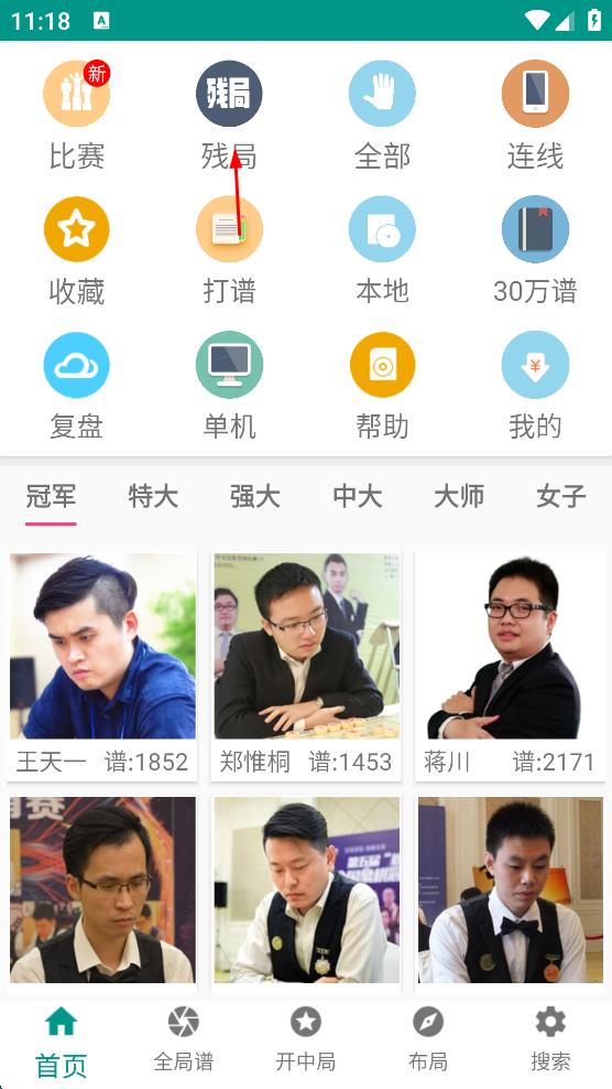 1、打開(kāi)象棋軟件,進(jìn)入首頁(yè)后,點(diǎn)擊頁(yè)面上方的“殘局”選項(xiàng),進(jìn)入殘局頁(yè)面。