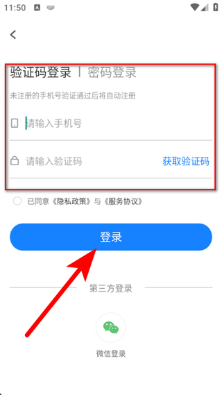 3、選擇驗證碼登錄,輸入手機(jī)號和驗證碼后點擊登錄,未注冊將自動注冊。