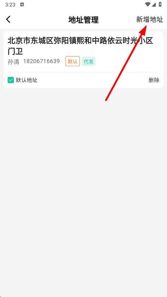 3、在地址管理界面,點(diǎn)擊右上角的新增地址選項,進(jìn)入新增地址頁面。