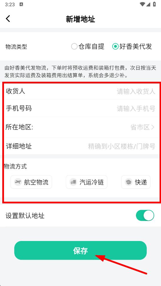 4、在新增地址頁面,依次填寫收貨人、手機(jī)號碼、所在地區(qū)、詳細(xì)地址等信息,填寫完畢后點(diǎn)擊保存按鈕,即可成功添加地址信息。