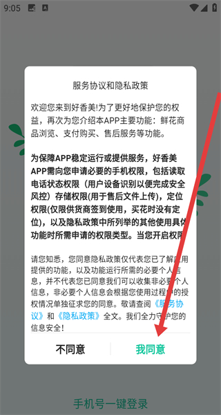 1、打開“好香美”APP,在服務(wù)協(xié)議和隱私政策界面點(diǎn)擊我同意。