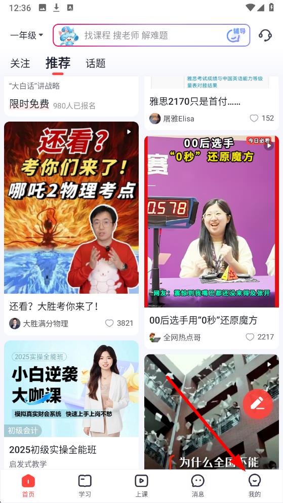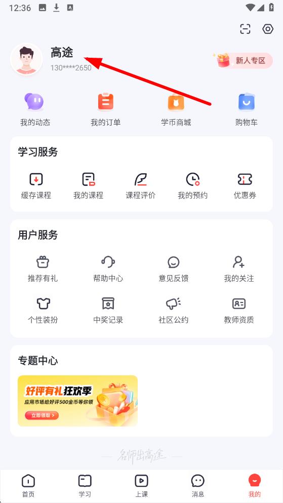 1、打開高途app進(jìn)入首頁,點(diǎn)擊底部導(dǎo)航欄中我的選項(xiàng),進(jìn)入個人相關(guān)操作界面。