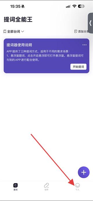1、打開提詞全能王APP,點(diǎn)擊右下角個(gè)人選項(xiàng),進(jìn)入個(gè)人中心頁(yè)面。