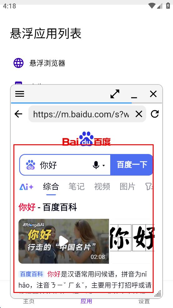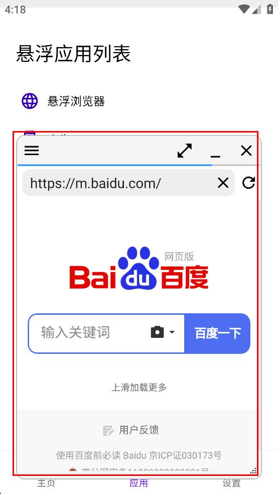 3、進(jìn)入懸浮瀏覽器后,可看到百度頁(yè)面,在搜索框輸入關(guān)鍵詞。