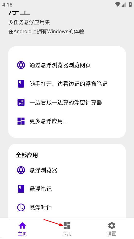1、打開(kāi)多任務(wù)懸浮應(yīng)用類APP,點(diǎn)擊頁(yè)面下方應(yīng)用。