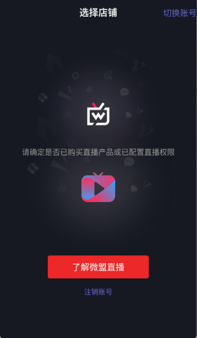 2、登錄成功后進入其中選擇店鋪,想要直播需要自己的店鋪已購買直播產(chǎn)品或者已經(jīng)配置直播權(quán)限,沒有配置的用戶可以點擊下方的了解微盟直播選項進行查看;