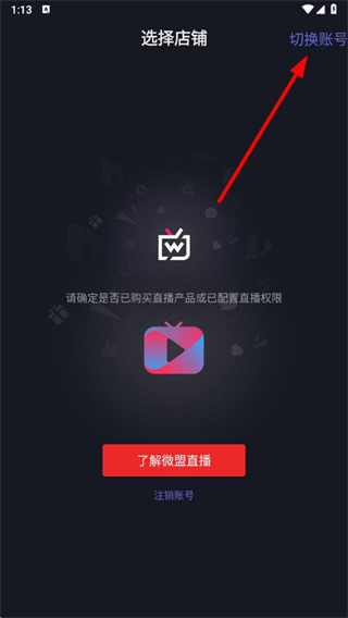 1、在選擇店鋪界面,點擊右上角切換賬號選項。