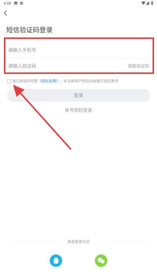 3、進入短信驗證碼登錄頁面,輸入手機號,點擊獲取驗證碼,填寫收到的驗證碼,并勾選我已閱讀并同意隱私政策。