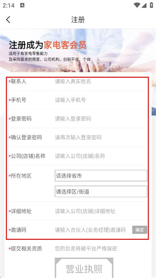 2、填寫聯(lián)系人、手機(jī)號(hào)、登錄密碼、公司名稱、所在地區(qū)、詳細(xì)地址、邀請(qǐng)碼等信息。