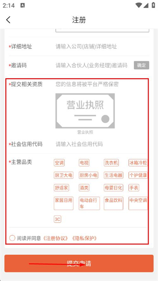 3、提交營業(yè)執(zhí)照、社會(huì)信用代碼,選擇主營品類,勾選同意相關(guān)協(xié)議后點(diǎn)擊提交申請(qǐng)。