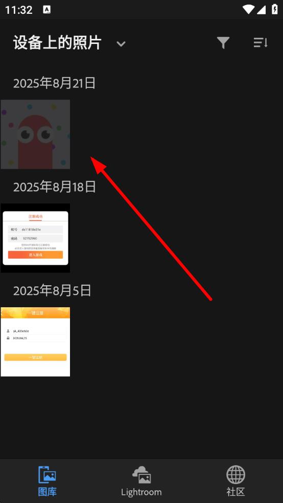 1、打開lr軟件進(jìn)入圖庫,在設(shè)備上的照片里找到要編輯的照片并點(diǎn)擊打開。