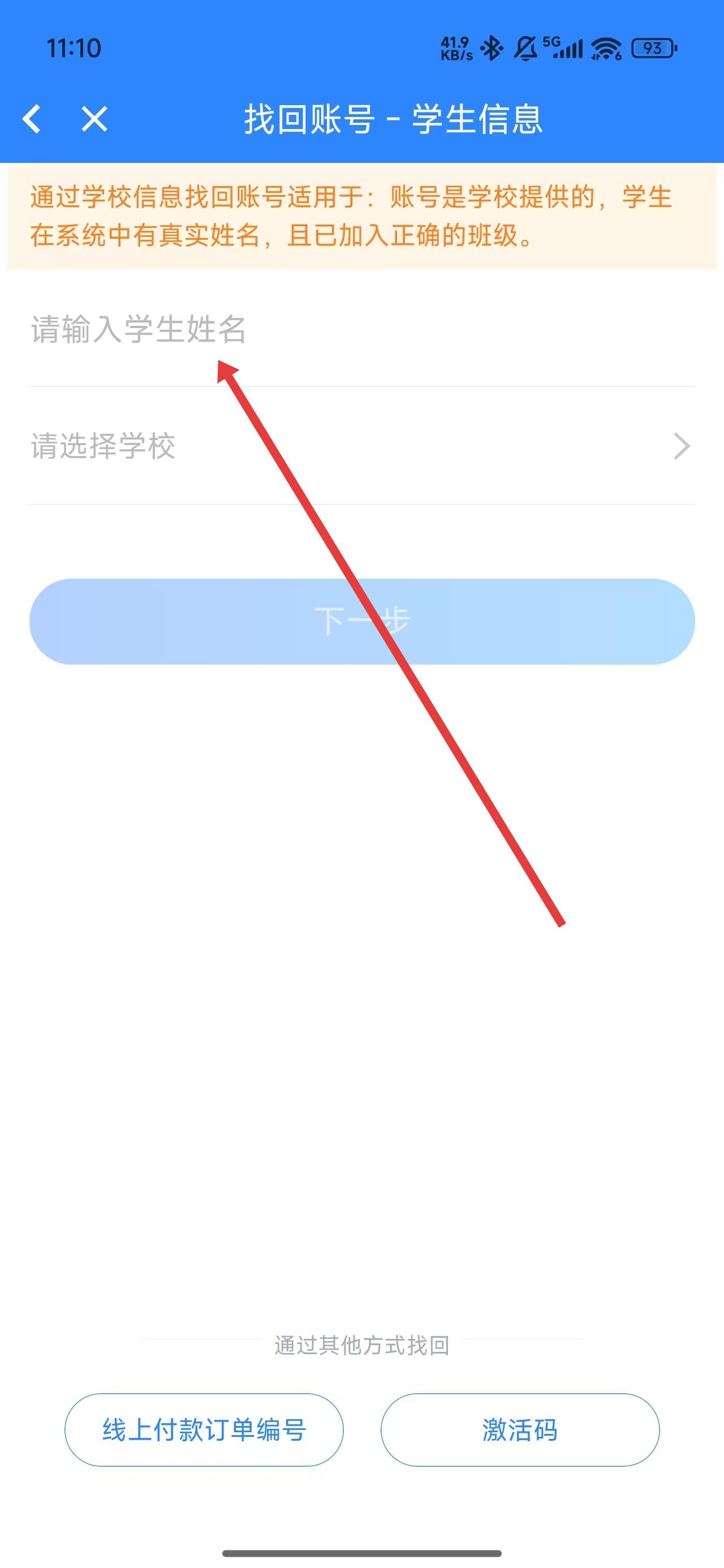 4、在進(jìn)入到找回賬號頁面中,點擊輸入框填寫姓名學(xué)校等信息后繼續(xù)找回操作。