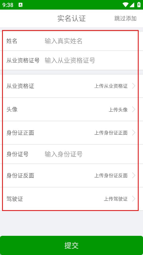 3、進入實名認(rèn)證頁面,依次輸入真實姓名、從業(yè)資格證號,上傳從業(yè)資格證、頭像、身份證正面、身份證反面、駕駛證。