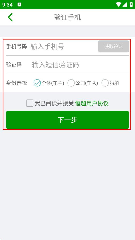 2、在登錄界面點擊注冊,進入驗證手機頁面,輸入手機號碼,點擊獲取驗證碼,輸入收到的驗證碼,選擇身份,勾選已閱讀并接受恒超用戶協(xié)議,點擊下一步。