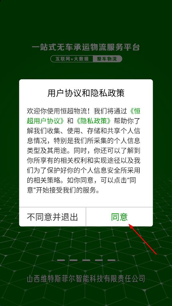 1、打開恒超物流,進入用戶協(xié)議和隱私政策頁面,點擊同意,進入登錄界面。