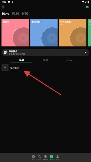 2、在音樂(lè)列表內(nèi),在歌單下點(diǎn)擊添加歌單的按鈕。