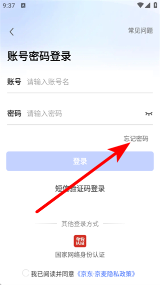 3、在賬號(hào)密碼登錄的頁面,點(diǎn)擊忘記密碼這個(gè)選項(xiàng)。
